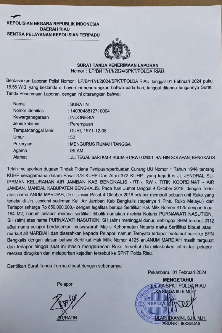 TINDAKTEGAS | DURI, BENGKALIS, (10/3/26) – Penanganan perkara dugaan sengketa kepemilikan ruko di wilayah Duri, Kabupaten Bengkalis, yang dilaporkan sejak tahun 2024 hingga kini belum menunjukkan kepastian hukum. Kondisi ini membuat pelapor, Suratin, mengaku berada dalam kondisi yang semakin sulit dan hampir kehilangan harapan atas proses hukum yang sedang berjalan.